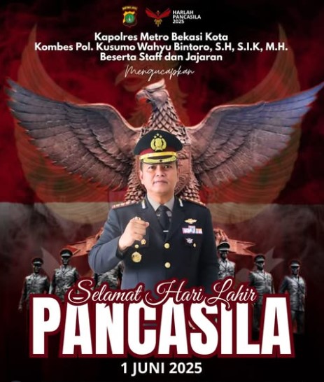 Dalam semangat persatuan dan kesatuan bangsa, Kapolres Metro Bekasi Kota Kombes Pol. Kusumo Wahyu Bintoro, S.H., S.I.K., M.H., beserta staf dan jajaran mengucapkan Selamat Hari Lahir Pancasila, 1 Juni 2025. Pancasila sebagai dasar negara menjadi pijakan utama dalam menjaga keutuhan NKRI serta mewujudkan pelayanan Polri yang Presisi, humanis, dan berintegritas.